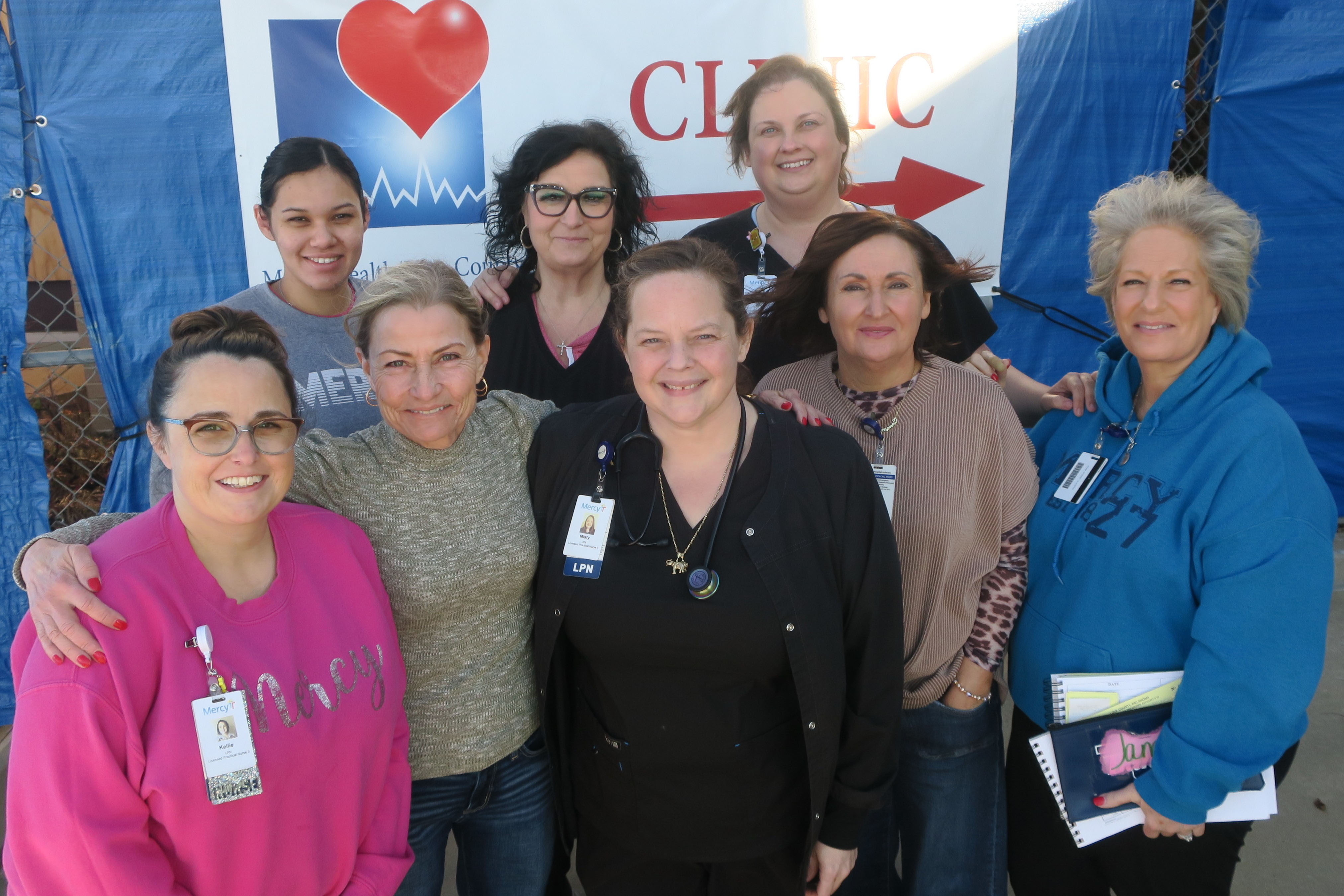 (January 12, 2025): Retiring after 45 Years: Patricia Owens, ARNP-CPN, family nurse practitioner, embraces several clinic colleagues at Mercy Health Love County in Marietta on her retirement day, December 31, 2024. (Front row) Kellie Westra, LPN; Owens; Misty McGee, LPN; Misti Kirk, Clinic Director; and Jana Brown, Business Office Coordinator. (Back row) Patient Representatives Noemi Carrasco, Christy Morehead, and Sherry Diaz. (Photo by Barbara Sessions)